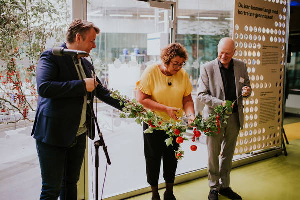 Landbruksminister Olaug Bollestad, restauranteier Sven Erik Renaa og gartner Kåre Wiig var med på den høytidelige åpningen av den nye ankomsthallen.