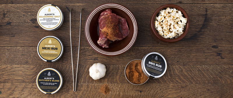 Grillmester Craig Whitson har vært ute og reist, og han har smakt seg frem til de optimale blandingene: Albert's Mexi Rub, BBQ Rub, Butcher's Blend og Seasoning Salt. Fasett har funnet den riktige emballasjen og designet serien på fire kydderblandinger som hever smaken på det meste. Albert-serien kommer også samlet i en 4-pakning med umiskjennelig lukt av røkte hickoryfliser.