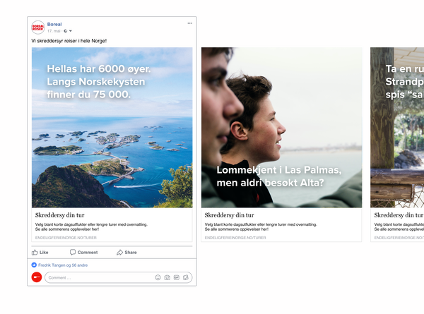 Kampanjen fikk egen landingsside på endeligferieinorge.no, og i tillegg laget vi digitale annonser til sosiale medier, programmatisk, GDM og SEM om dagsturer, pakketurer, skreddersydde turer og muligheten til å huke av på “bucket listen”.