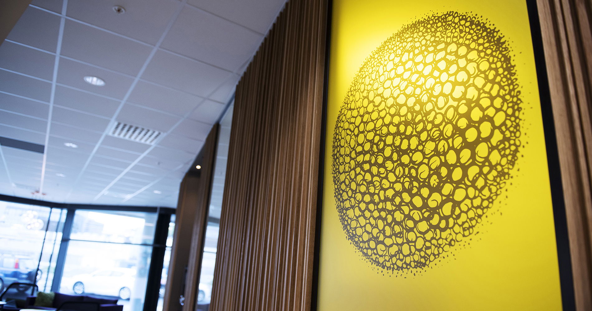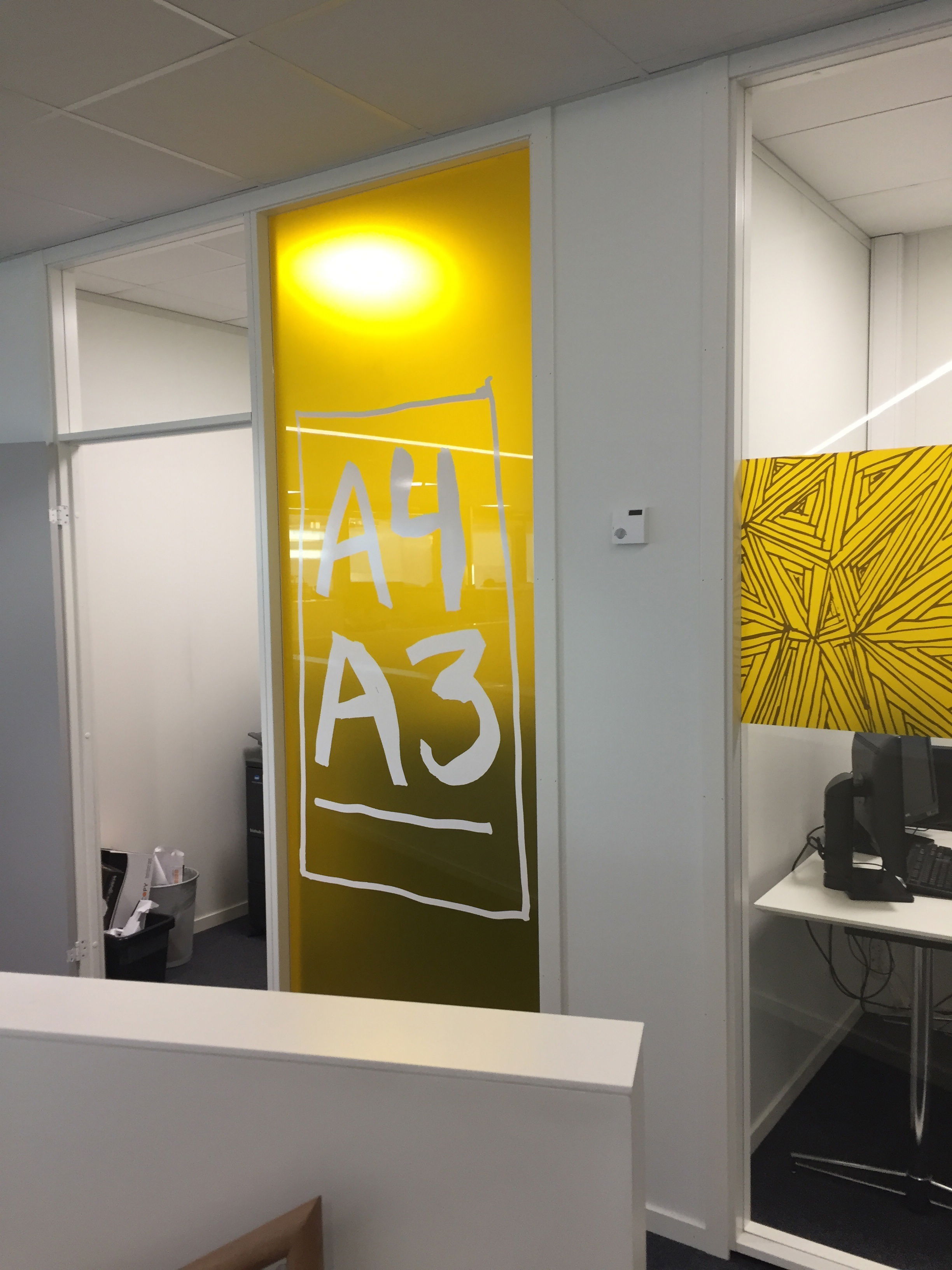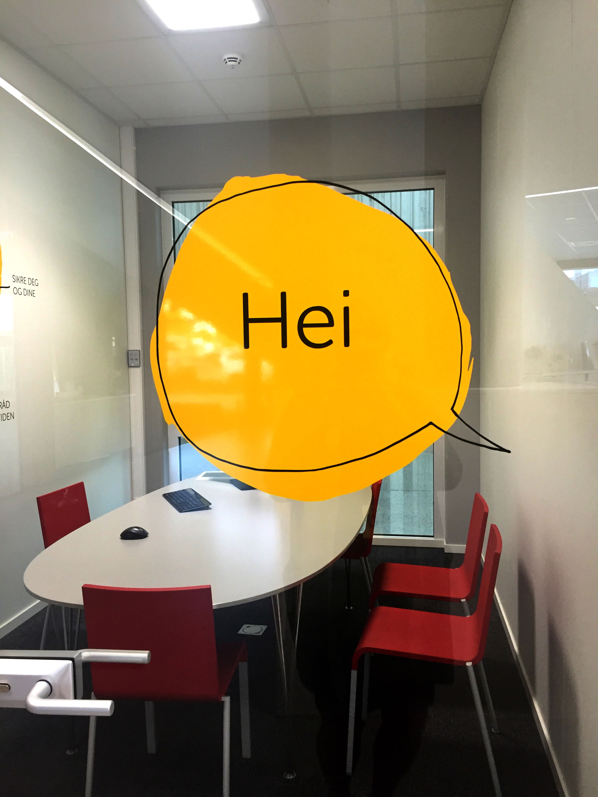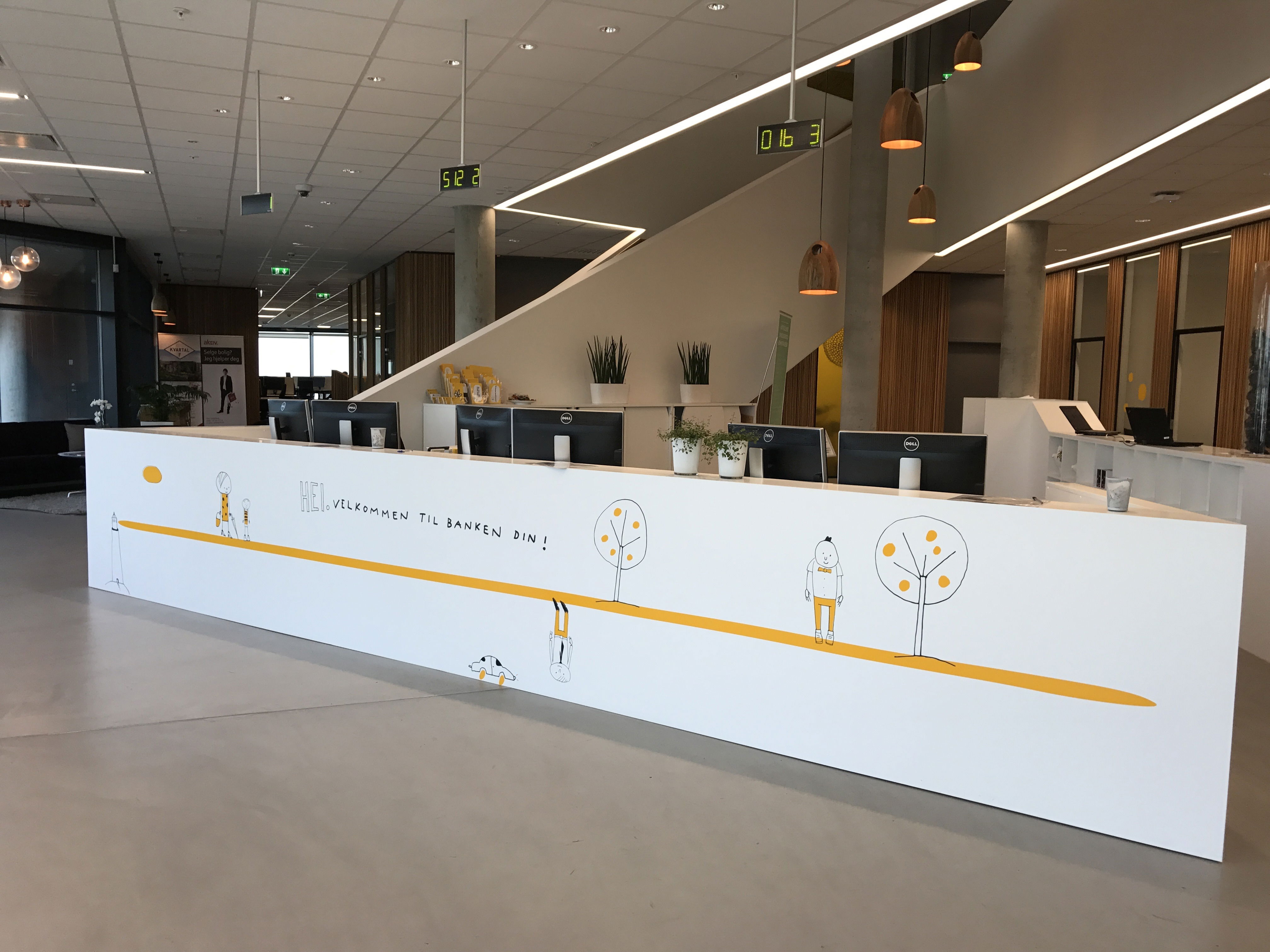 Streken og identiteten til Sandnes Sparebank (nå Den Gule Banken) er gjennomgående i lokalene. Gul, frostet folie er brukt både i fellesområdet og på kontorene. Vindusdekoren har også en praktisk funksjon, å gi kunder og besøkende litt mer skjerming.