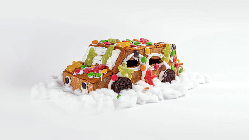 - Vi begynte å snakke om hjemmelading, et ord som ligner litt på hjemmelaget. Så da konstruerte vi ordet hjemmeladet og så at vi kunne lage hjemmelagede biler som passet til uttrykket, blant annet dette lille stykket pepperkakekunst, bakt av Elin Minde og sønnen Orvel. For å få til den fantastiske bevegelsen har vi ikke brukt computer graphics, men et manuelt pizzabrett med snurr.