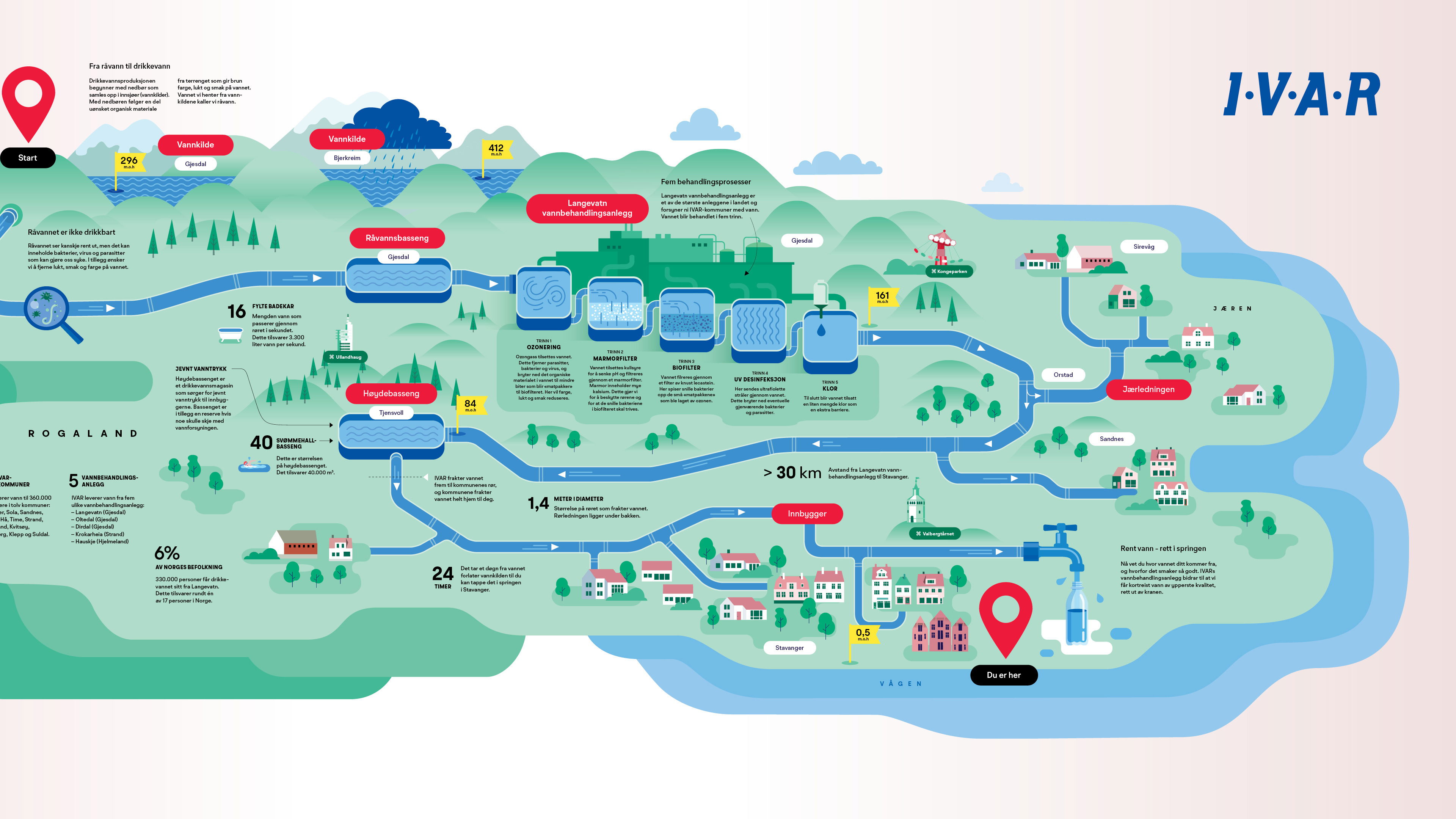 I samarbeid med illustratør Berit Sømme og IVAR ble komplekse tall illustrert med interessante og forståelige sammenligninger, som for eksempel at 3.300 liter vann per sekund tilsvarer 16 fylte badekar. For å gjøre reisen enda mer tilgjengelig og ‘interaktiv’, inkluderte vi lettgjenkjennelige geografiske landemerker som Kongeparken, Ullandhaugtårnet og Valbergtårnet og spørsmål knyttet til illustrasjonen, og de besøkende kunne vinne premier ved å svare på spørsmål knyttet til informasjonen i illustrasjonen.
